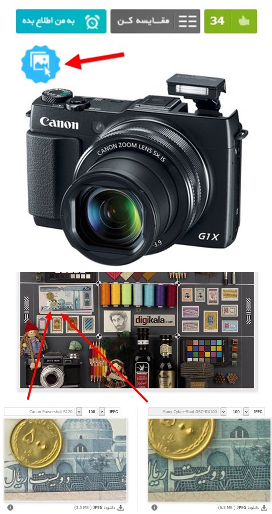 سایت دیجی کالا که گویا بزرگترین و با ارزش ترین سایت و فروشگاه اینترنتیه خدمات زیادی ارائه میده که یکی از بهترین های آن خدمات ارئه ی بررسی های متنی ،تصویری در مورد کالاهای مختلف است. این کار دیجی کالا باعث می شود خریدی بسیار آگاهانه داشت.تازگی ها این سایت دوباره تغییراتی در سایت ایجاد کرده که علاوه بر قالب شامل ارائه ی خدمات جدیدی هم میشه ! امکان جدیدی که می خوام معرفی کنم ،سرویس مقایسه ی عکس های دوربین های عکاسی د رکنار یکدیگر به صورتی حرفه ای می باشد. در این سرویس دیجی کالا اومده و مثل سایت های معتبر عکاسی ،صحنه ای متشکل از اشیاء کوچک و بزرگ رنگارنگ کنار هم چیده ( البته با ظرافت و رنگ و بویی ایرانی مثل اسکناس 20 تومانی قدیم و عکس سهراب سپهری )و امکان مقایسه ی نمونه عکس های دوربین های مختلف( همزمان 4 دوربین ) را فراهم کرده که به نظرم کار خیلی ارزشمندیه و کمک زیادی به علاقمندان عکاسی در انتخاب و خرید دوربین دیجیتال خواهد کرد. برای ورود به این بخش کافیه در صفحه ی دوربین مورد بررسی درست بالای عکس دوربین روی دایرره ی آبی رنگی که نشان عکس رو داره کلیک کنیم.
